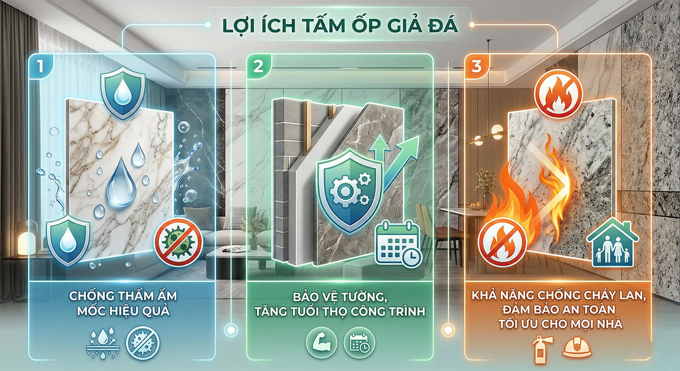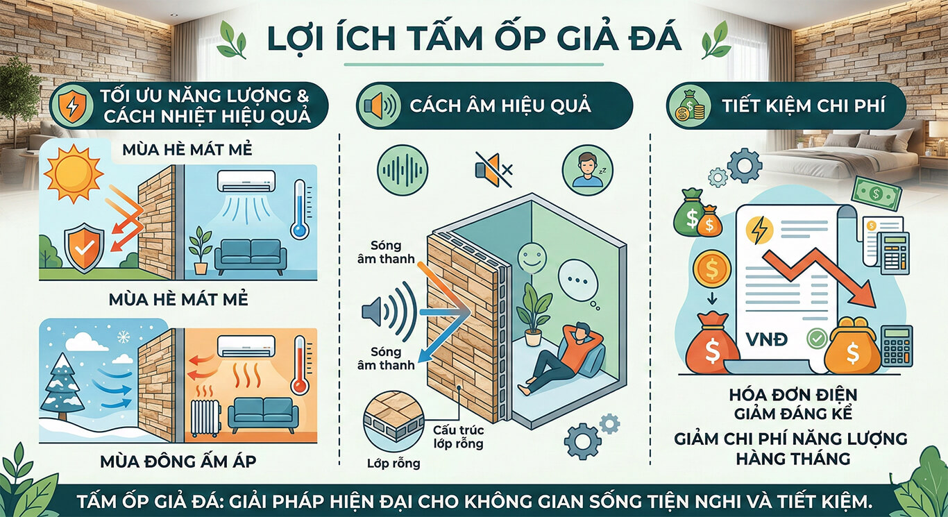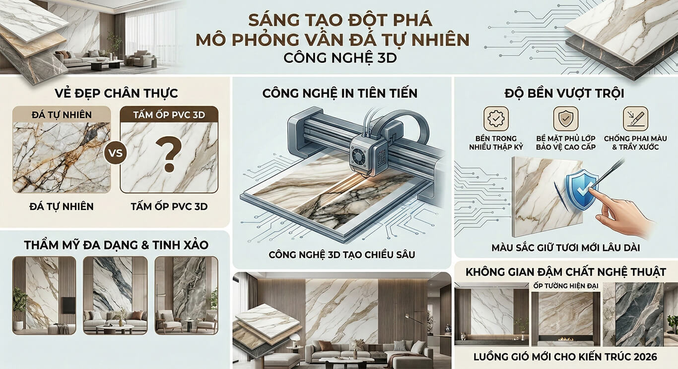 Năm 2026, Lợi ích tấm ốp giả đáđang trở thành tâm điểm trong xu hướng kiến trúc thông minh, khi vật liệu này không chỉ nâng tầm thẩm mỹ với vẻ đẹp sang trọng như đá tự nhiên mà còn tối ưu chi phí và hiệu quả năng lượng. Sở hữu thiết kế linh hoạt, độ bền cao và thân thiện môi trường, tấm ốp giả đá chính là giải pháp hiện đại giúp hoàn thiện không gian sống đẳng cấp, bền vững và tinh tế cho mọi công trình.