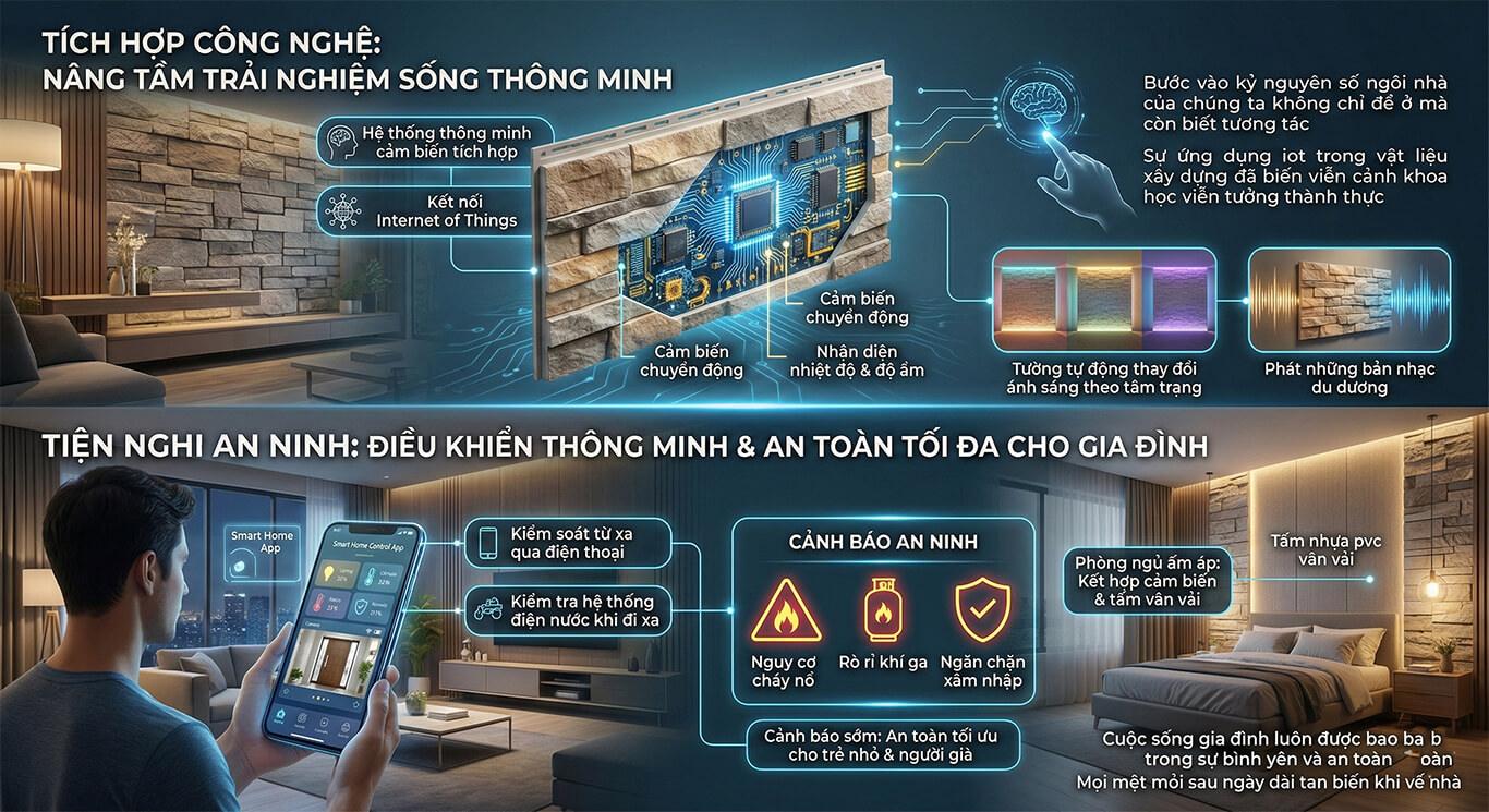 Công nghệ tấm ốp thông minh còn có khả năng cảnh báo sớm các nguy cơ cháy nổ hay rò rỉ khí ga. Điều này đặc biệt quan trọng giúp bảo vệ những thành viên nhỏ tuổi và người già yếu. Cuộc sống gia đình sẽ luôn được bao bọc trong sự bình yên và an toàn.