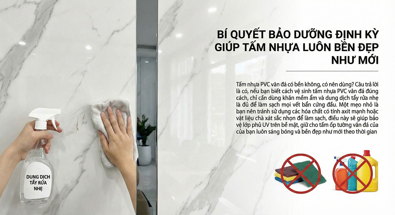 Và cuối cùng, đừng quên rằng việc bảo quản đúng cách, chẳng hạn như cách vệ sinh tấm nhựa PVC vân đá đúng cách, sẽ giúp tuổi thọ của sản phẩm kéo dài tối đa, giữ cho không gian sống luôn mới mẻ và rạng rỡ.