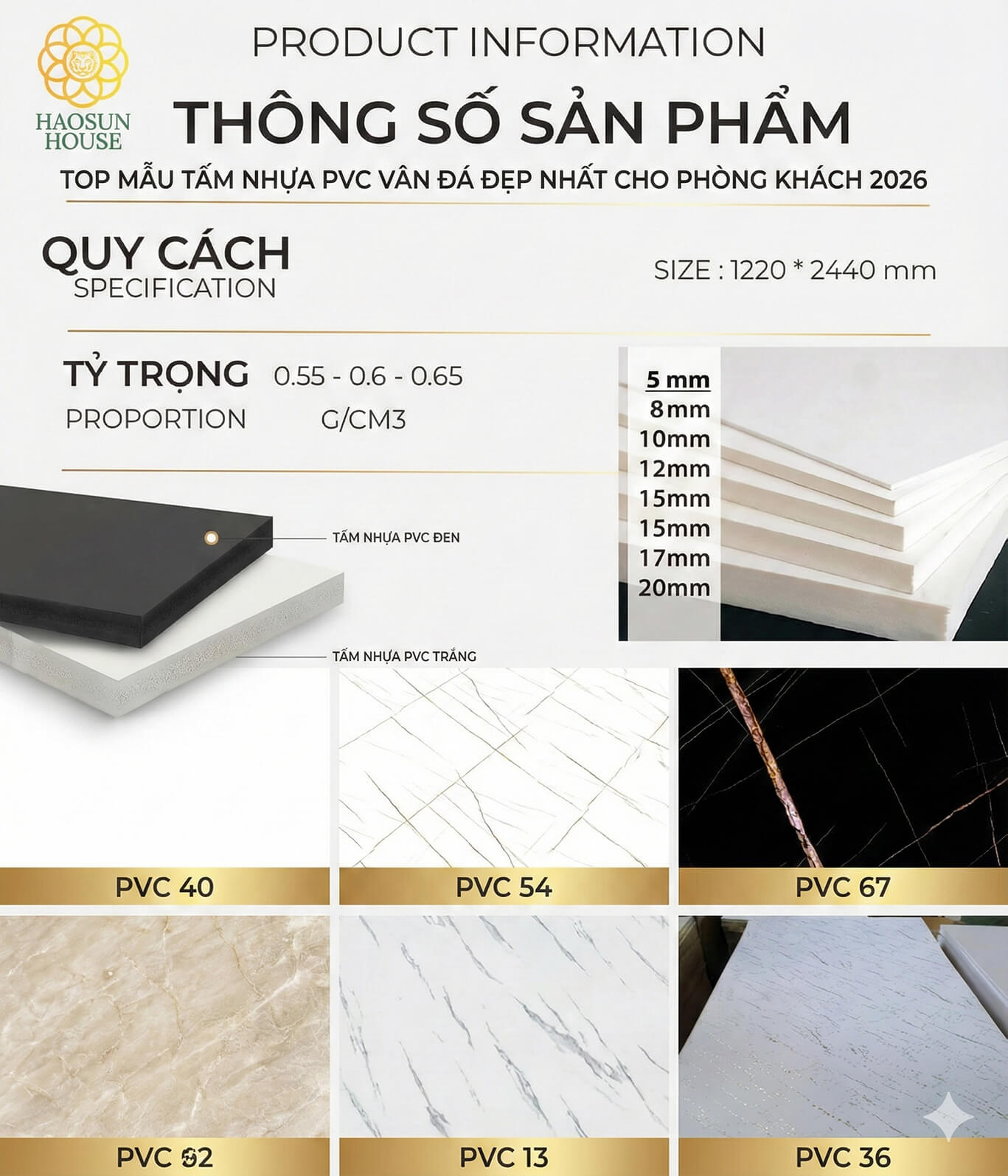 Bạn có thể tham khảo Bảng giá tấm pvc tại Haosunhouse để có cái nhìn tổng quan về tổng phí hoàn thiện, thường bao gồm chi phí vật tư, keo dán và chi phí thi công tấm nhựa PVC vân đá trọn gói, giúp bạn dễ dàng kiểm soát chi tiêu.