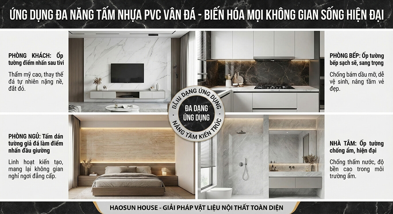 Với ưu thế về thẩm mỹ và tính linh hoạt, ứng dụng tấm nhựa PVC vân đá thực sự đa dạng trong việc kiến tạo không gian sống hiện đại.