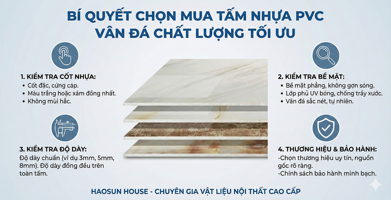 Chọn đúng loại tấm nhựa PVC vân đá không đơn giản chỉ là nhìn mẫu mã đâu bạn nhỉ. Mình hay kiểm tra cốt nhựa trước, nếu là nhựa nguyên sinh thì yên tâm lắm vì cứng cáp, không giòn vỡ. Nhìn bề mặt mà thấy vân in mờ nhạt hay dễ bong tróc là nên tránh liền, vì sẽ nhanh xấu lắm.