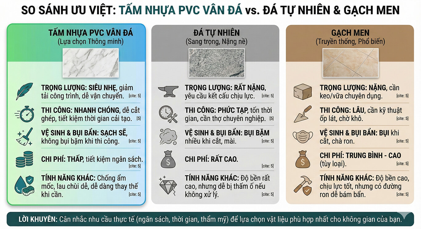 IV. So sánh tấm nhựa vân đá chuẩn với các vật liệu khác