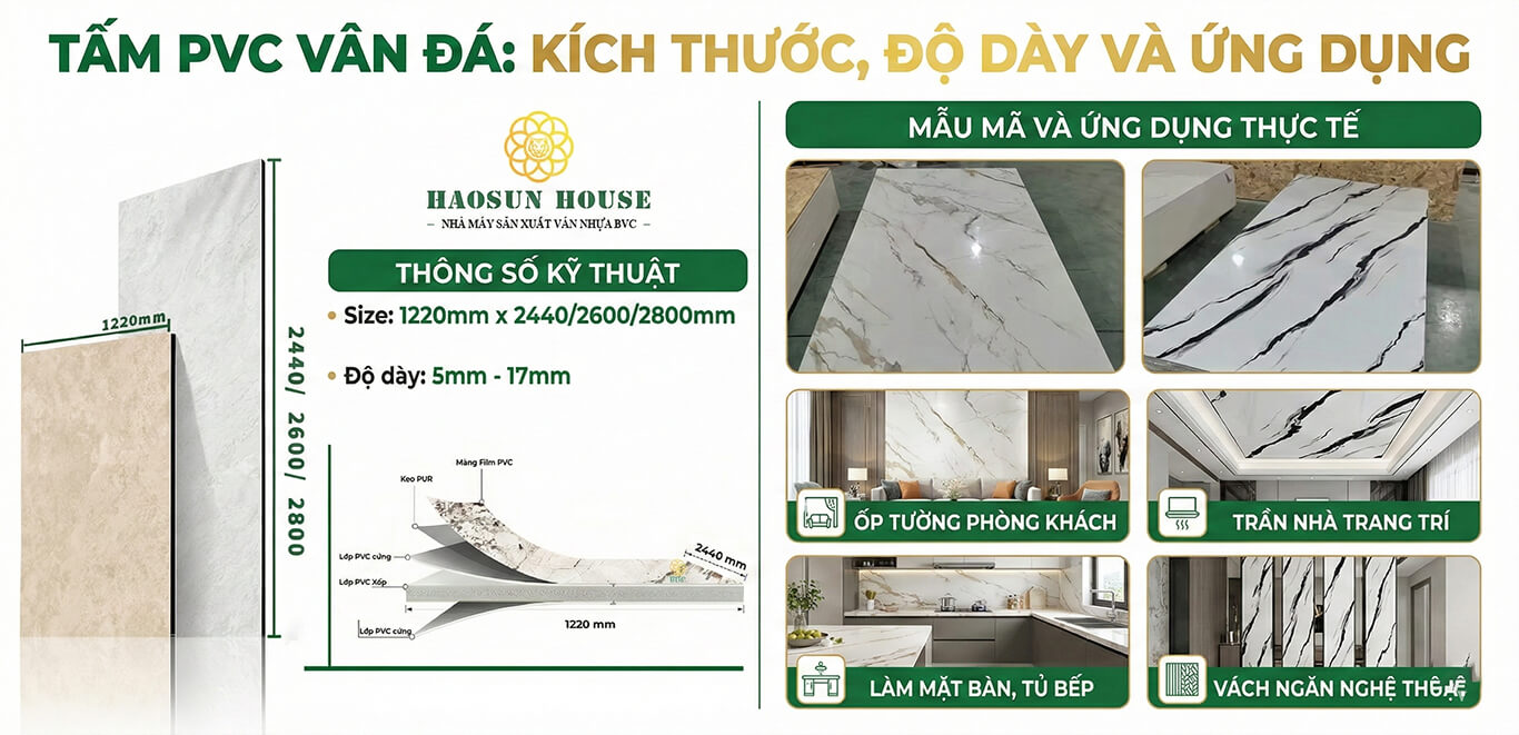IV. Kích thước độ dày và ứng dụng tấm PVC vân đá phù hợp mọi không gian