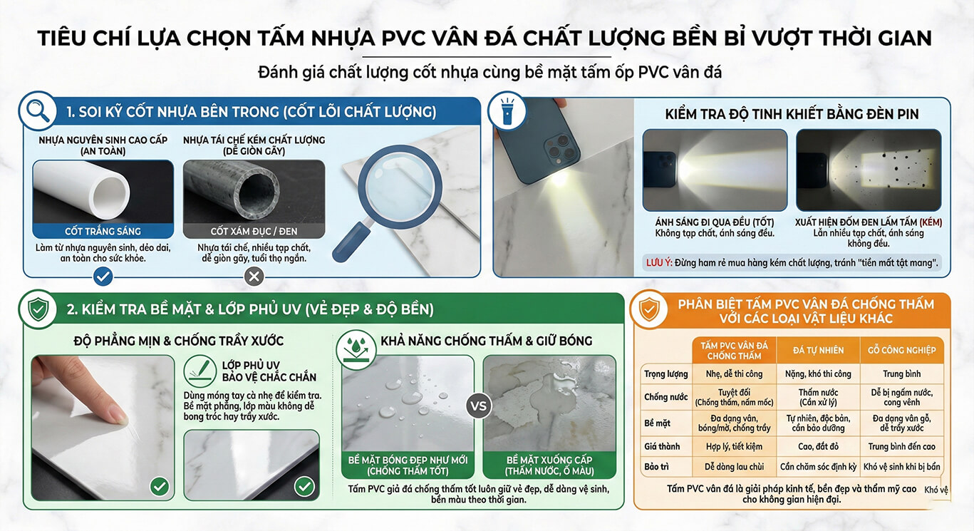 II. Tiêu chí lựa chọn tấm nhựa PVC vân đá chất lượng bền bỉ vượt thời gian