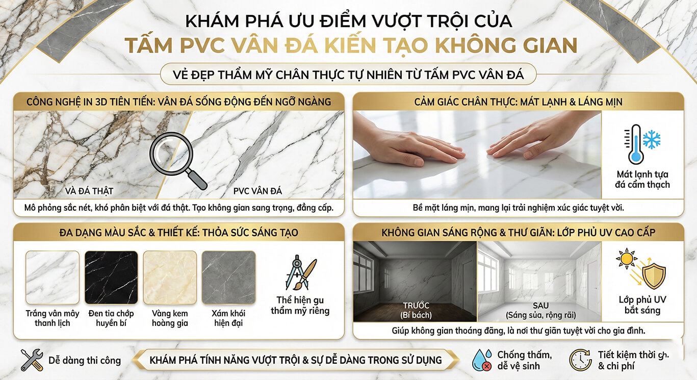 Chúng tôi đã cùng bạn khám phá chi tiết về tấm nhựa PVC vân đá từ ưu điểm vượt trội đến những tiêu chí lựa chọn và các lưu ý quan trọng khi thi công bảo quản. Hy vọng những thông tin này sẽ là kim chỉ nam hữu ích giúp bạn đưa ra quyết định sáng suốt nhất cho tổ ấm của mình.