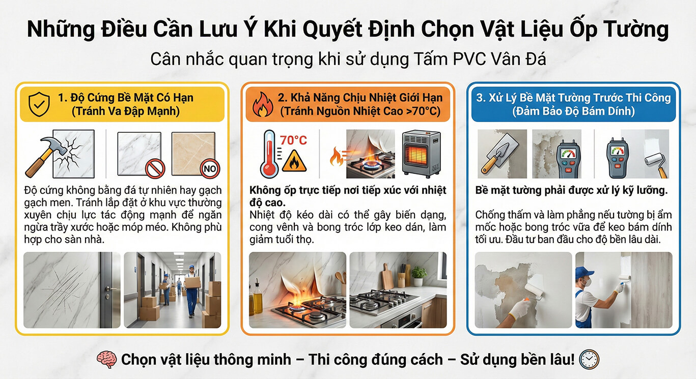 Thêm vào đó khả năng chịu nhiệt của nhựa cũng có giới hạn nhất định. Bạn không nên ốp tấm PVC ở những nơi tiếp xúc trực tiếp với nguồn nhiệt cao trên 70 độ C như ngay sát bếp ga công nghiệp hay lò sưởi. Nhiệt độ cao kéo dài có thể làm tấm nhựa bị biến dạng hoặc bong tróc lớp keo dán làm giảm tuổi thọ công trình.