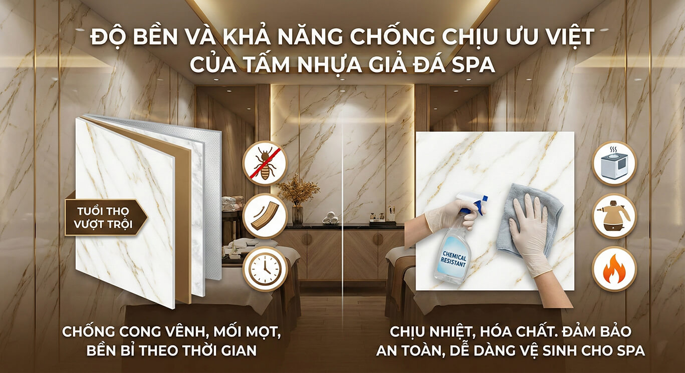 Đặc tính chống thấm và chống mối mọt là những ưu điểm lớn nhất mà gỗ tự nhiên hay giấy dán tường không bì kịp. Nó cũng không bị cong vênh dưới tác động thay đổi nhiệt độ thất thường của môi trường spa đâu. Bạn hãy xem bài So sánh tấm nhựa PVC vân đá để thấy rõ sự khác biệt nhé.