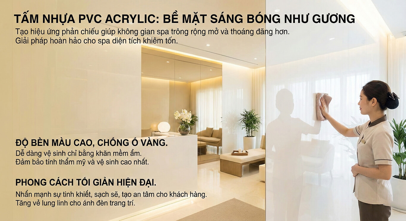 Loại Tấm ván nhựa pvc phủ Acrylic này rất được ưa chuộng trong các spa có phong cách thiết kế tối giản hiện đại. Nó nhấn mạnh sự tinh khiết và sạch sẽ tạo cảm giác an tâm tuyệt đối cho khách hàng. Sự bóng bẩy của nó cũng làm tăng thêm vẻ lung linh cho ánh đèn trang trí nữa.