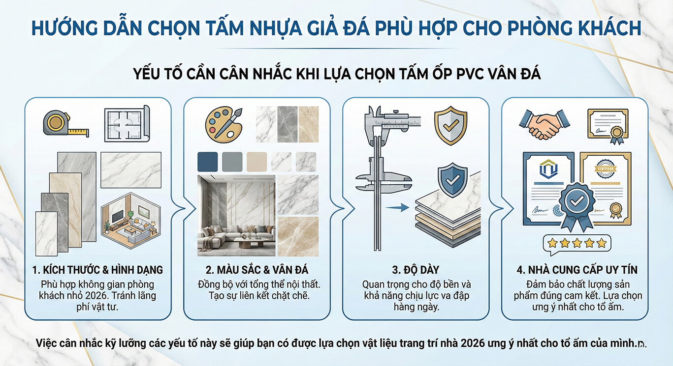 Khi lựa chọn Tấm ván nhựa pvc vân đá cho phòng khách bạn cần xem xét kỹ lưỡng một số yếu tố quan trọng để đảm bảo sự hài hòa lâu dài. Đầu tiên là kích thước và hình dạng của không gian phòng khách nhỏ 2026 để chọn loại tấm có khổ phù hợp nhằm tránh lãng phí vật tư không đáng có. Màu sắc và vân đá cần đồng bộ với tổng thể thiết kế nội thất của căn nhà bạn để tạo sự liên kết chặt chẽ.