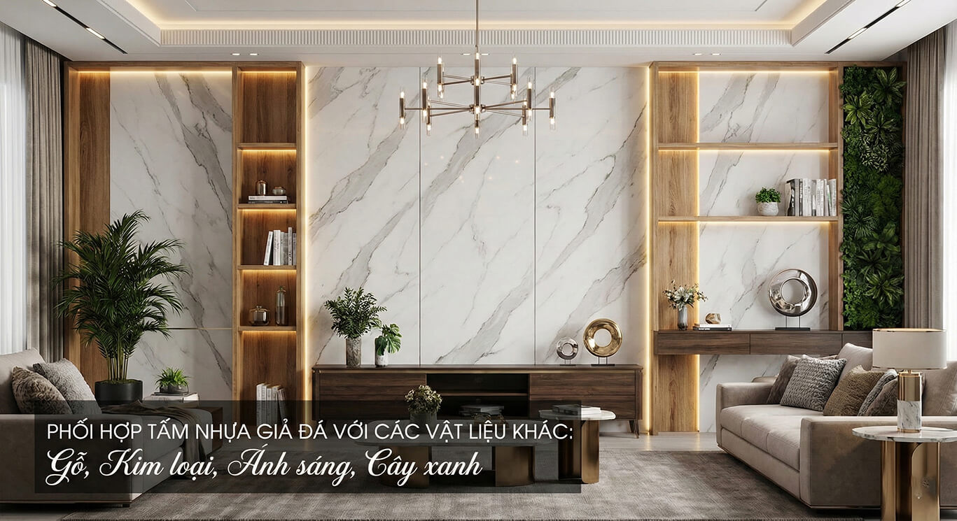 Để tạo nên một không gian phòng khách hài hòa và ấn tượng thì việc phối hợp tấm nhựa giả đá với các vật liệu khác là điều vô cùng quan trọng. Bạn hoàn toàn có thể kết hợp chúng với gỗ tự nhiên để mang lại sự ấm cúng mộc mạc hoặc với các chi tiết kim loại bóng để tăng thêm vẻ hiện đại. Ánh sáng đèn led cũng đóng vai trò then chốt trong việc tôn vinh vẻ đẹp hoàn mỹ của loại đá nhân tạo ốp tường cao cấp này.
