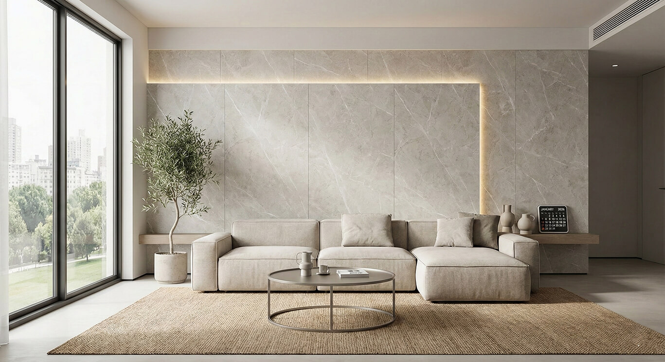 Cuối năm 2025 và đầu năm 2026 các phong cách thiết kế nội thất hiện đại và tối giản tiếp tục thống trị không gian phòng khách của các gia đình. Tấm nhựa giả đá phòng khách với các vân đá thanh lịch tông màu trung tính trở thành vật liệu lý tưởng để kiến tạo nên những không gian sống xanh sạch. Chúng giúp phòng khách của bạn toát lên vẻ tinh tế nhẹ nhàng nhưng không kém phần đẳng cấp tạo cảm giác thư thái mỗi khi trở về nhà.