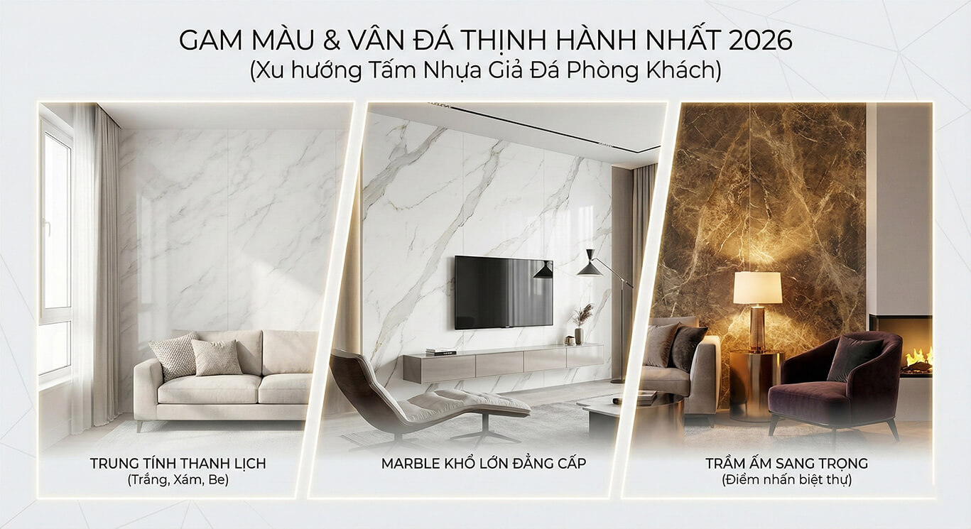 Trong năm 2026 những gam màu trung tính như trắng xám be sẽ tiếp tục là lựa chọn hàng đầu cho các mẫu tấm nhựa giả đá phòng khách xu hướng mới. Đặc biệt là mẫu tấm nhựa giả đá vân đá cẩm thạch cho phòng khách hiện đại với các đường vân mây nhẹ nhàng hay vân đá marble khổ lớn sẽ được ưu tiên. Những thiết kế này không chỉ mang lại cảm giác rộng rãi thoáng đãng mà còn toát lên sự đẳng cấp cho không gian tiếp khách của gia đình.