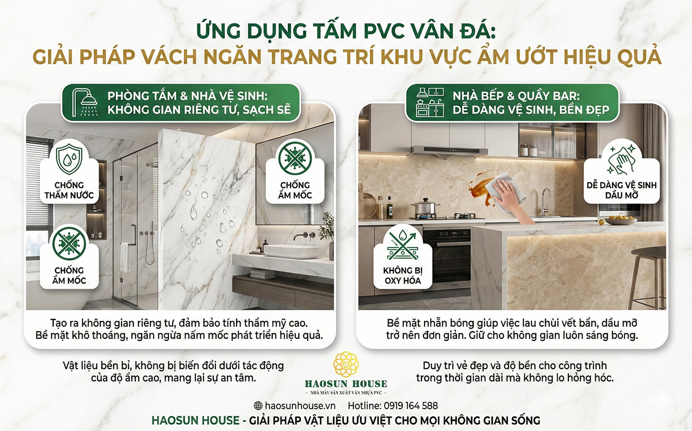 Nhờ đặc tính chống thấm nước và chống ẩm mốc tấm nhựa PVC vân đá rất phù hợp để làm vách ngăn cho các khu vực như phòng tắm hoặc nhà bếp. Sản phẩm giúp tạo ra không gian riêng tư mà vẫn đảm bảo tính thẩm mỹ cao sạch sẽ và khô thoáng cho người sử dụng. Bề mặt nhẵn bóng cũng giúp việc vệ sinh dầu mỡ hay vết bẩn ở các khu vực này trở nên dễ dàng hơn bao giờ hết.