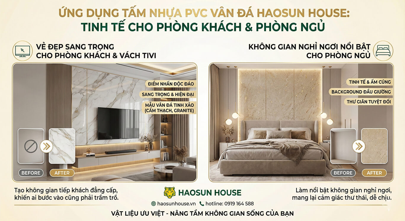 Việc Ứng dụng tấm nhựa PVC vân đá này giúp phòng khách và phòng ngủ trở nên ấm cúng hơn đồng thời dễ dàng phối hợp với các đồ nội thất khác như sofa hay giường tủ. Vật liệu nhẹ dễ thi công nên không tốn quá nhiều thời gian hoàn thiện làm ảnh hưởng đến sinh hoạt của gia đình. Đây là giải pháp lý tưởng cho những ai muốn đổi mới không gian sống một cách nhanh chóng và hiệu quả tức thì.