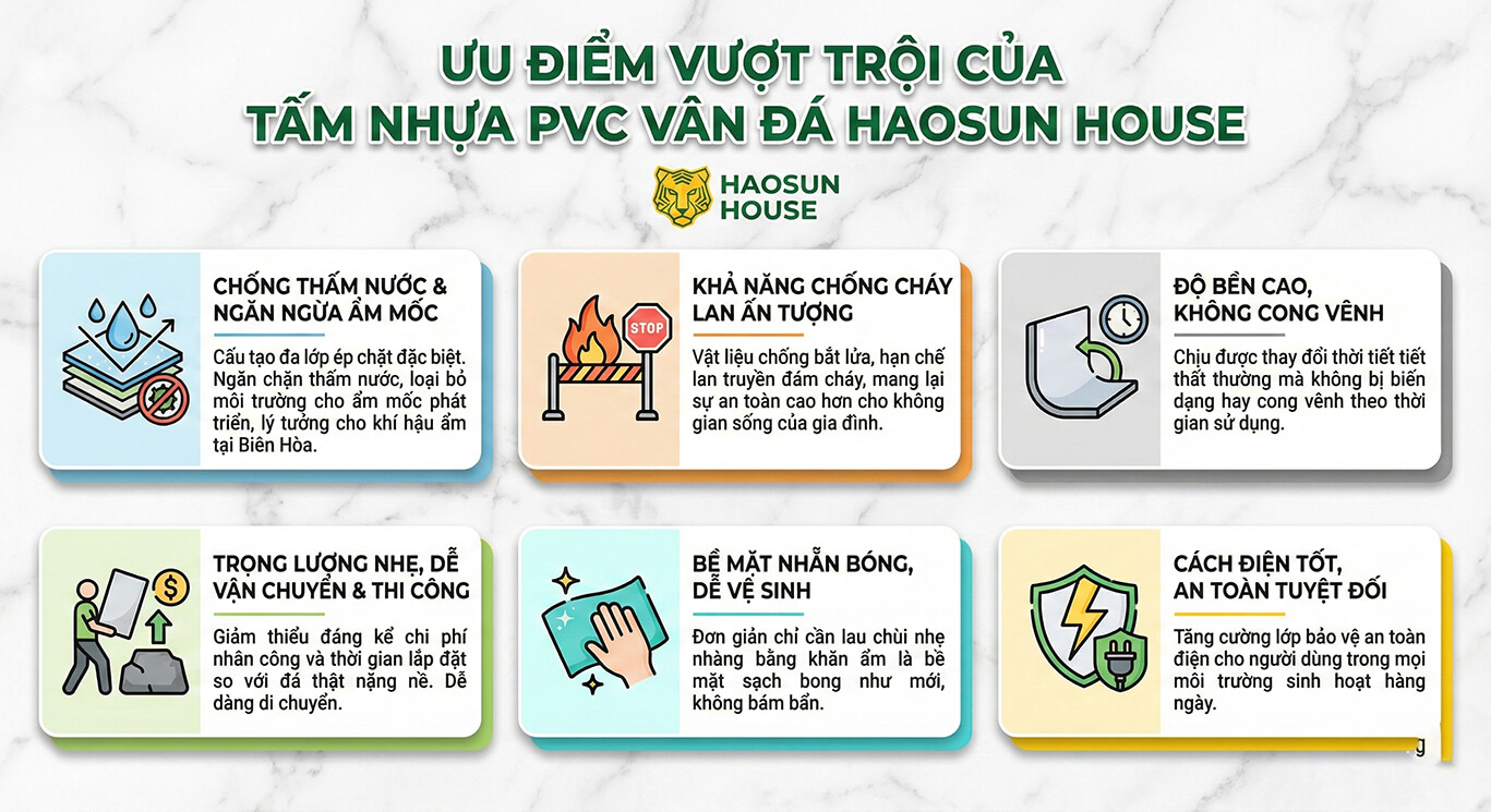 Tấm PVC vân đá có cấu tạo đặc biệt gồm nhiều lớp ép chặt giúp chống thấm nước vượt trội ngăn ngừa ẩm mốc phát triển trong môi trường ẩm ướt như khí hậu tại Biên Hòa. Vật liệu Tấm ván nhựa pvc còn sở hữu khả năng chống cháy lan ấn tượng mang lại sự an toàn hơn cho không gian sống của gia đình bạn. Độ bền cao giúp tấm nhựa không bị cong vênh hay biến dạng theo thời gian sử dụng dù thời tiết có thay đổi thất thường.