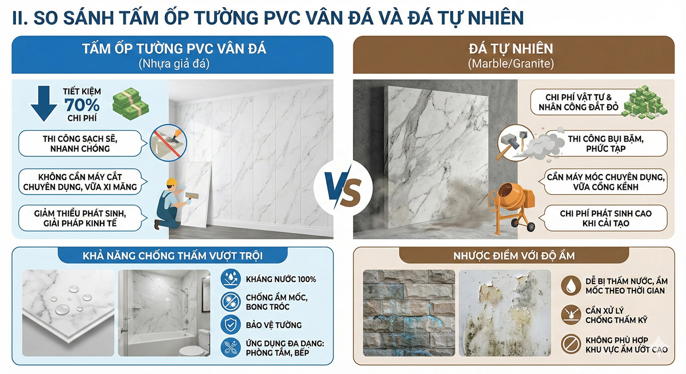 II. So sánh tấm ốp tường PVC vân đá và đá tự nhiên