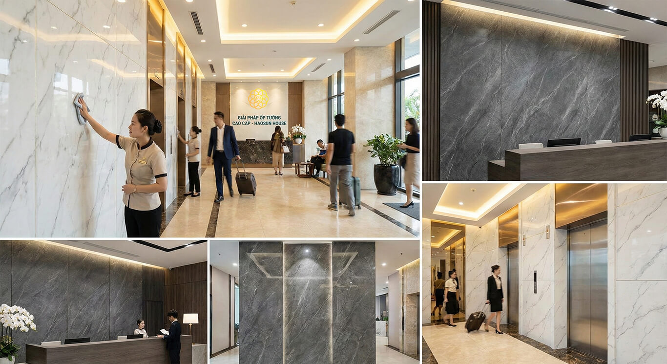 Tại các không gian thương mại mật độ đi lại cao như sảnh chờ hay thang máy, độ bền là yếu tố tiên quyết. Tấm PVC Marble là lựa chọn vừa kinh tế vừa đảm bảo tính thẩm mỹ cao.