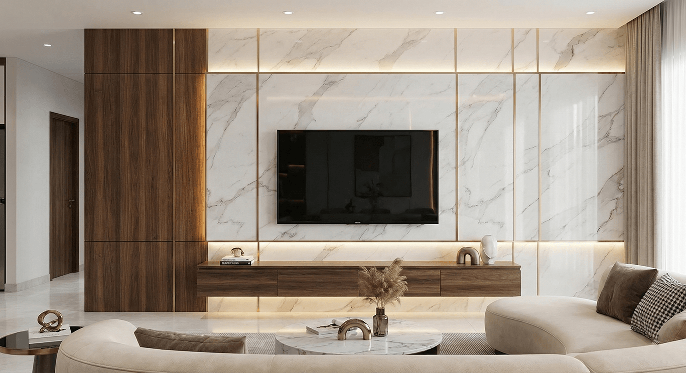 Thiết kế vách tivi phòng khách sang trọng và hiện đại