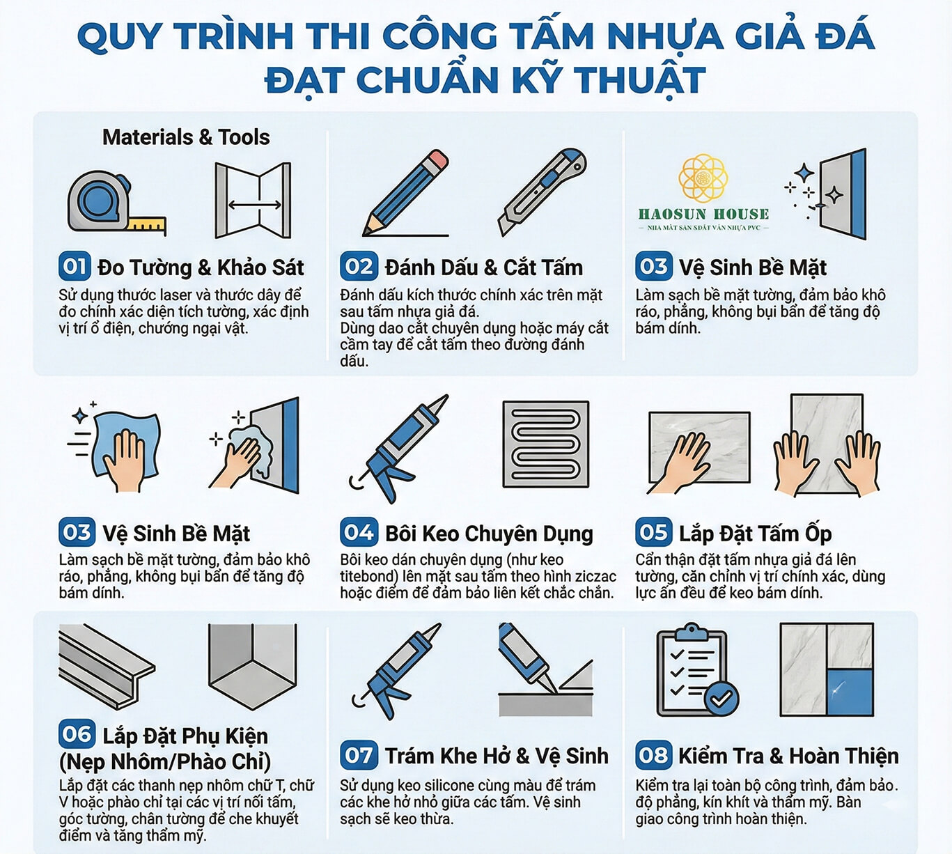 Chuẩn bị bề mặt tường và vật tư phụ kiện thi công tấm ốp