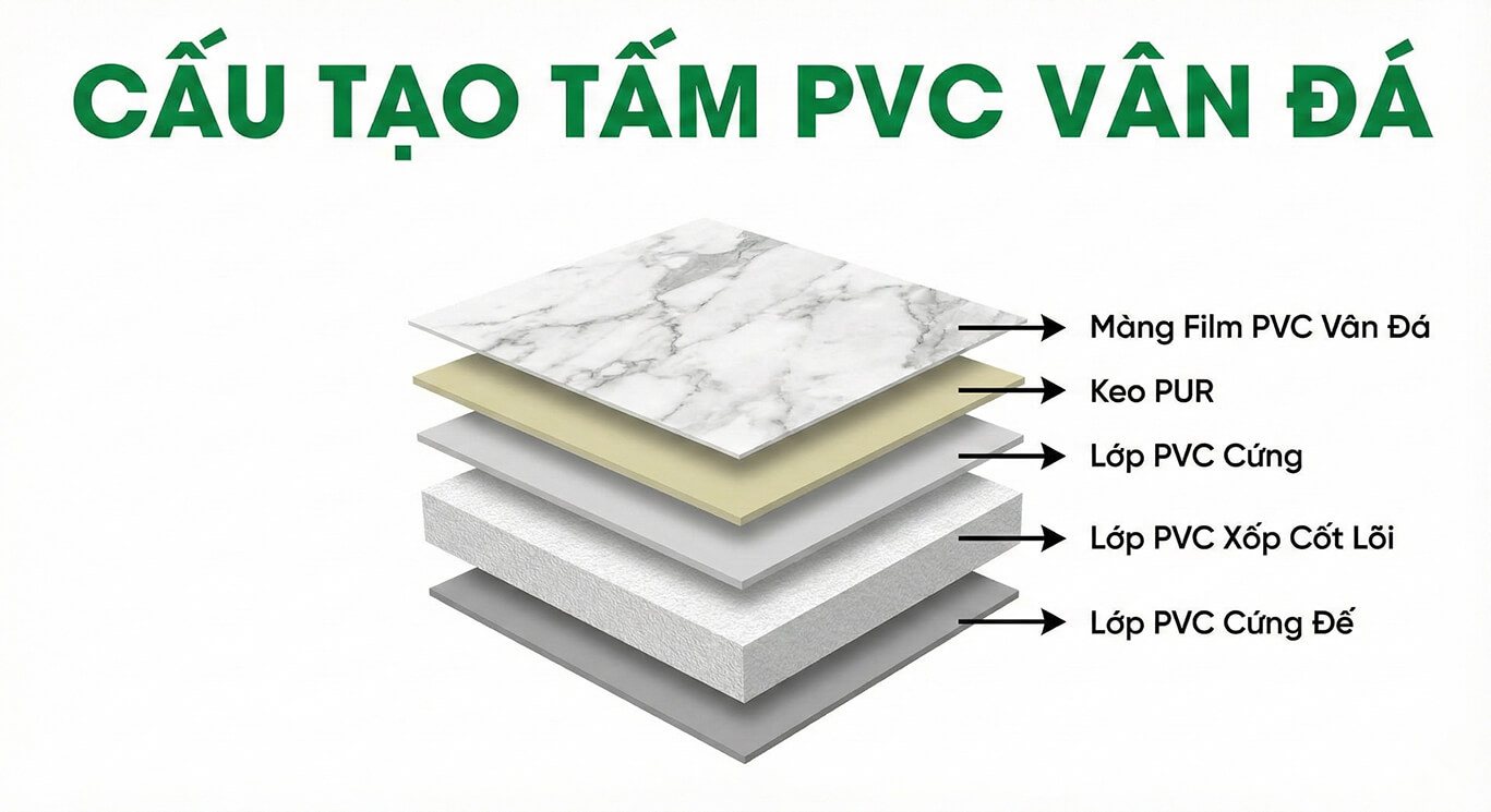 Tấm PVC vân đá thường có cấu tạo gồm lớp đế PVC lớp họa tiết vân đá lớp bảo vệ UV và lớp phủ chống mài mòn ở trên cùng. Các lớp này được ép chặt dưới nhiệt độ cao tạo nên một vật liệu có khả năng chống thấm nước chống ẩm và chống cong vênh hiệu quả trong môi trường Việt Nam. Cấu trúc này đảm bảo sản phẩm giữ được vẻ đẹp và độ bền lâu dài khi không phải chịu tải trọng lớn hay tác động va đập liên tục.