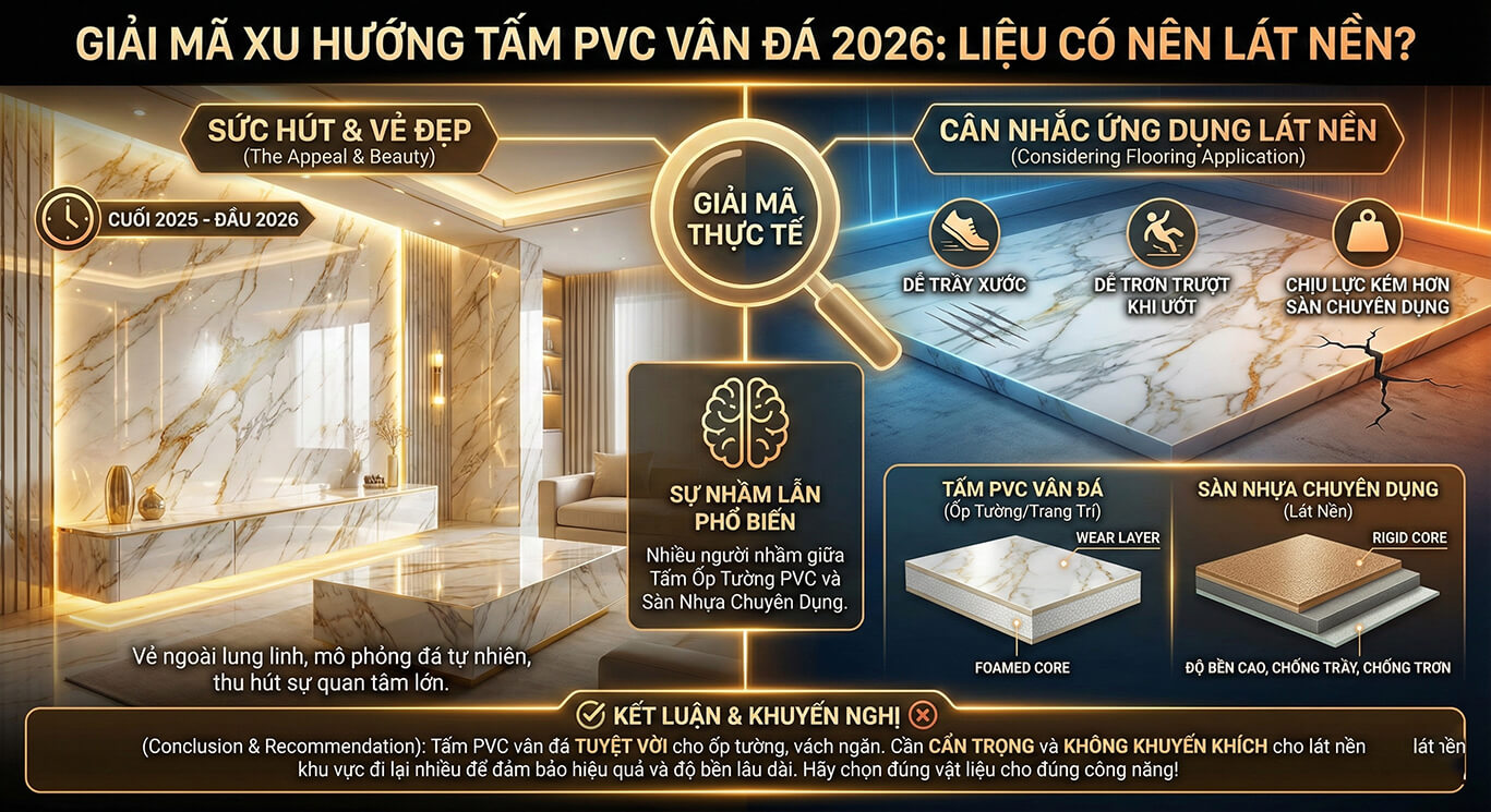 Tấm PVC vân đá đang là một vật liệu trang trí nội thất thu hút nhiều sự quan tâm vào giai đoạn cuối năm 2025 đầu năm 2026 nhờ vẻ ngoài lung linh. Tuy nhiên việc ứng dụng tấm pvc vân đá lát nền cần được xem xét kỹ lưỡng để đảm bảo hiệu quả và độ bền lâu dài cho công trình của bạn. Nhiều người tiêu dùng thường nhầm lẫn giữa tấm PVC vân đá và các loại sàn nhựa chuyên dụng khác nên đôi khi dẫn đến những lựa chọn chưa thực sự phù hợp với công năng sử dụng thực tế đâu.