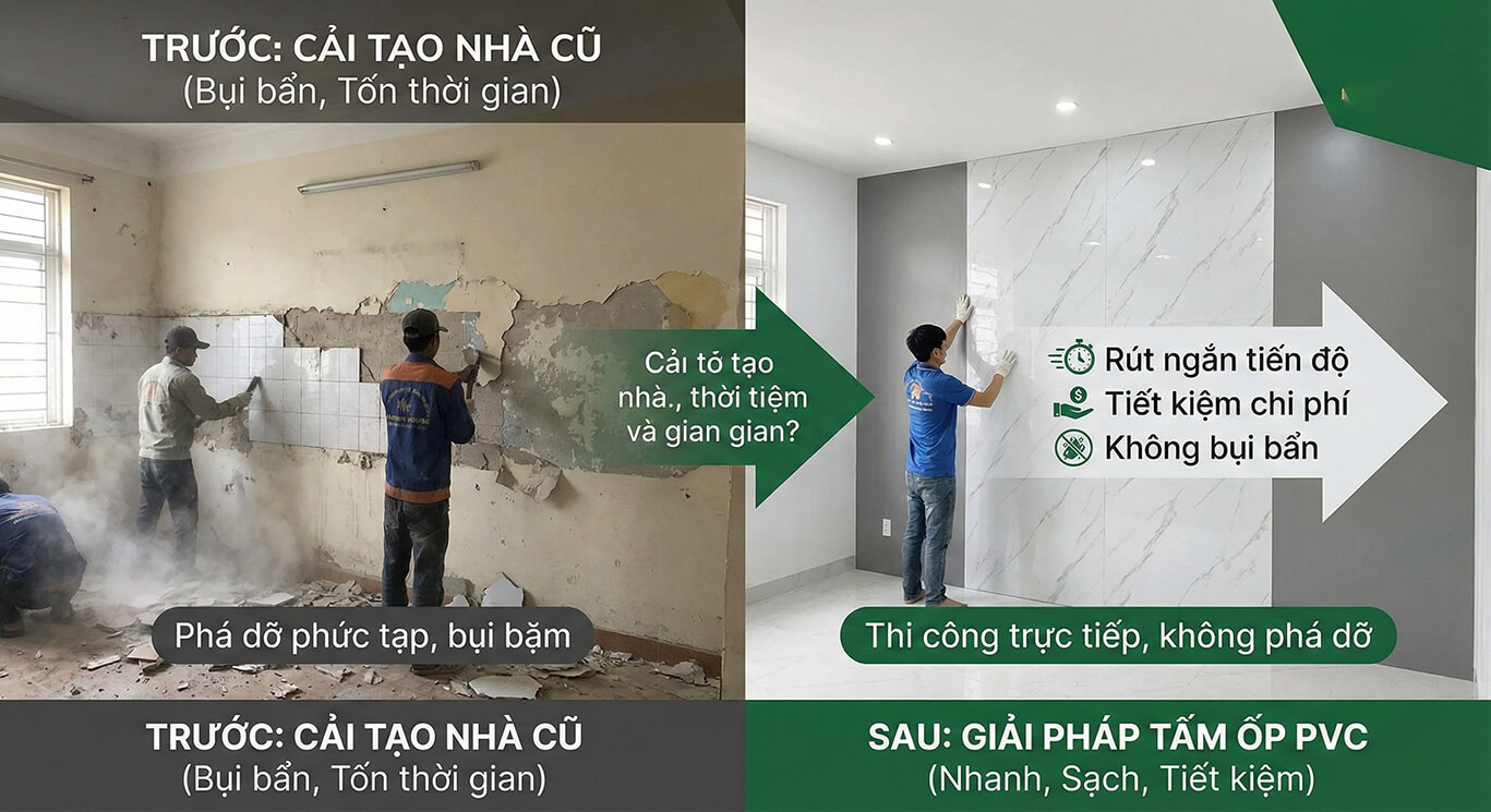 Việc cải tạo nhà cũ bằng sơn hay gạch men thường gây bụi bẩn và mất nhiều thời gian. Tấm ốp nhựa cho phép thi công trực tiếp lên nền gạch cũ hoặc tường bong tróc.