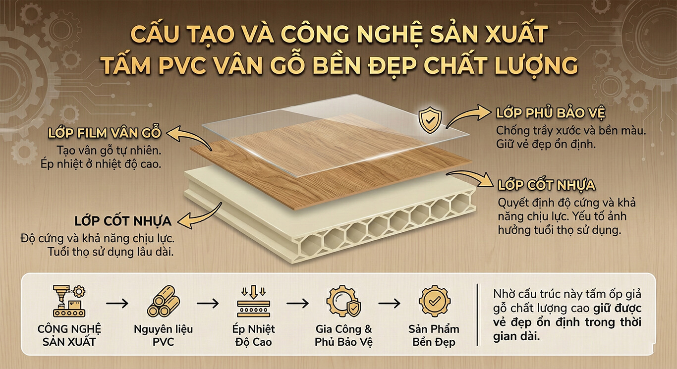 Một tấm PVC vân gỗ tiêu chuẩn gồm lớp cốt nhựa lớp film vân gỗ và lớp phủ bảo vệ. Cốt nhựa quyết định độ cứng và khả năng chịu lực. Đây là yếu tố ảnh hưởng trực tiếp đến tuổi thọ sử dụng.